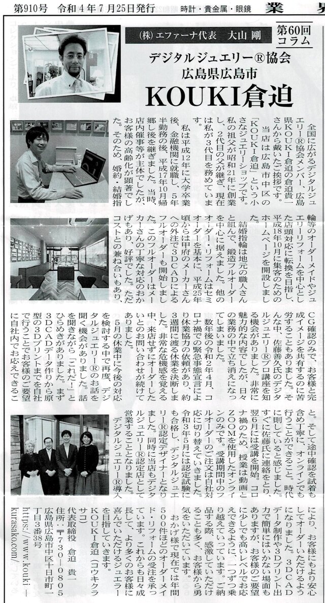 デジタルジュエリー®協会メンバーである株式会社エファーナの大山剛社長が同紙にコラムを担当されている関係でお声がけいただきました。